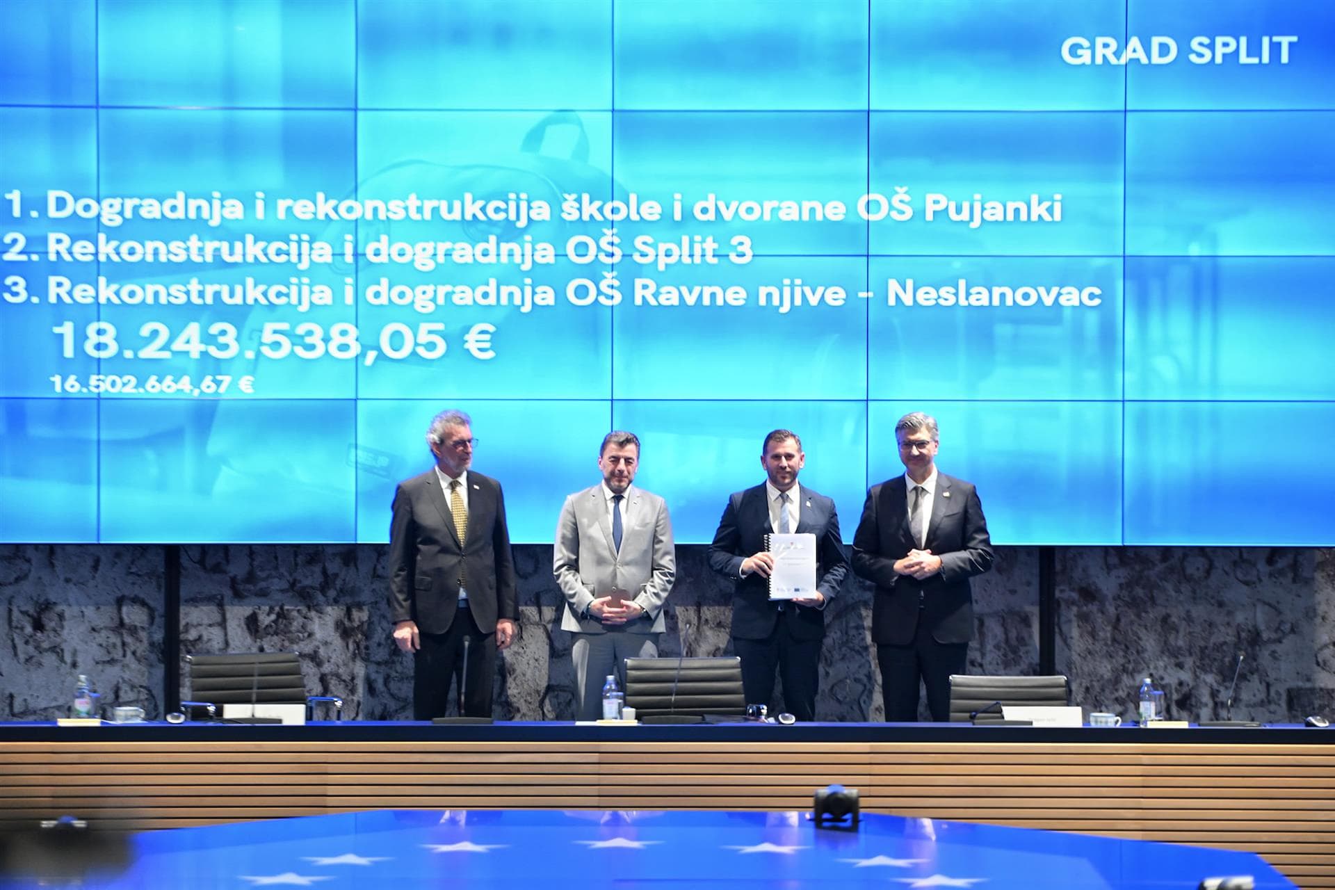 Svečana dodjela ugovora za Poziv „Izgradnja, rekonstrukcija i opremanje osnovnih škola za potrebe jednosmjenskog rada i cjelodnevne škole“ održana je u četvrtak, 26. veljače 2026. godine, u Nacionalnoj i sveučilišnoj knjižnici u Zagrebu. Ugovore su uručili predsjednik Vlade Republike Hrvatske Andrej Plenković i ministar znanosti, obrazovanja i mladih Radovan Fuchs, dok ih je u ime Grada Splita potpisao gradonačelnik Tomislav Šuta.