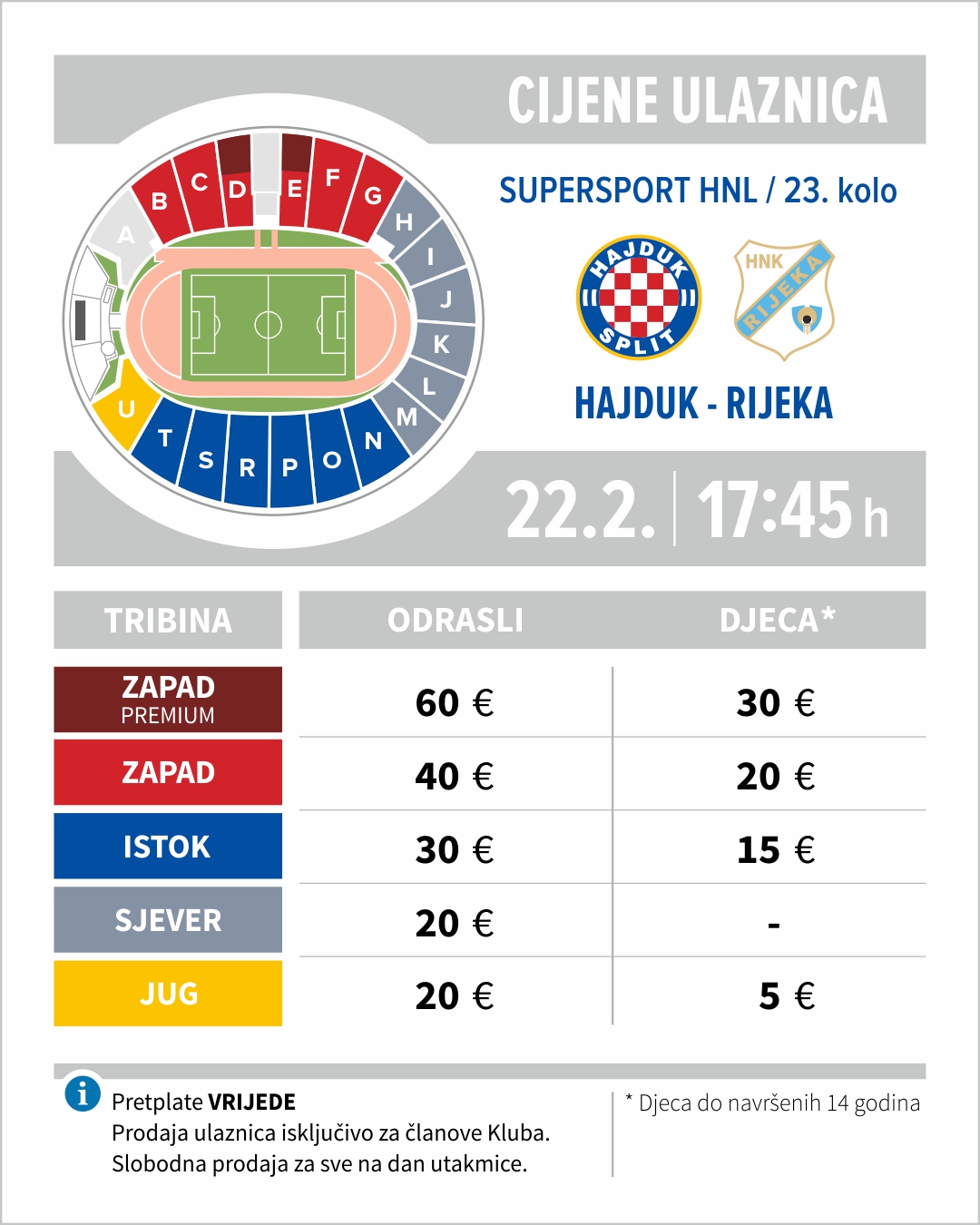 Započela je prodaja ulaznica za utakmicu 23. kola SuperSport HNL, Hajduk – Rijeka, koja će se odigrati na Poljudu, ovu nedjelju 22. veljače 17.45. Do dana utakmice pravo kupnje imaju isključivo aktivni članovi Kluba, a preostale karte su u slobodnoj prodaju na dan same utakmice.