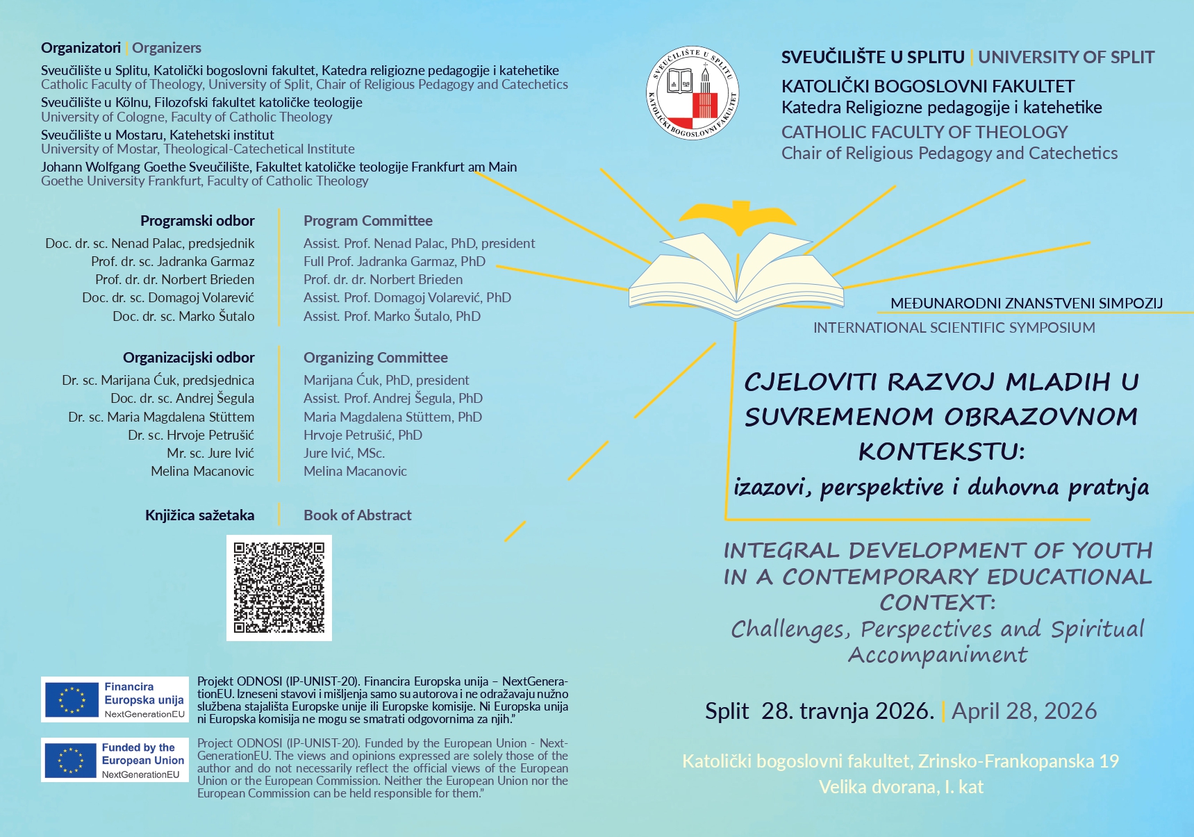Katolički bogoslovni fakultet Sveučilišta u Splitu, Katedra religiozne pedagogije i katehetike, Sveučilište u Köln, Filozofski fakultet katoličke teologije, Teološko-katehetski institut Sveučilišta u Mostar i Johann Wolfgang Goethe Sveučilište Fakultet katoličke teologije Frankfurt am Main, organiziraju Međunarodni znanstveni simpozij pod nazivom – Cjeloviti razvoj mladih u suvremenom obrazovnom kontekstu: Izazovi, perspektive i duhovna pratnja.