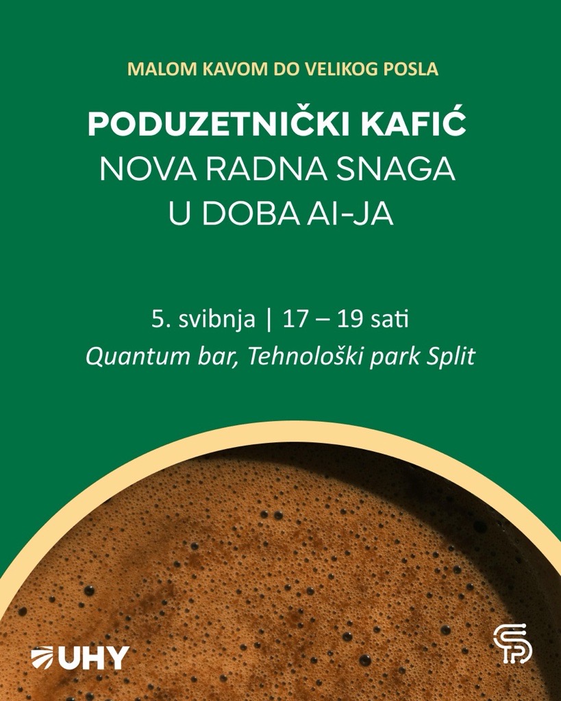 Novo izdanje Poduzetničkog kafića pod nazivom „Nova radna snaga u doba AI-ja“, će se održati 5. svibnja 2026. godine u 17:00 sati u Tehnološkom parku Split (caffe bar Quantum).