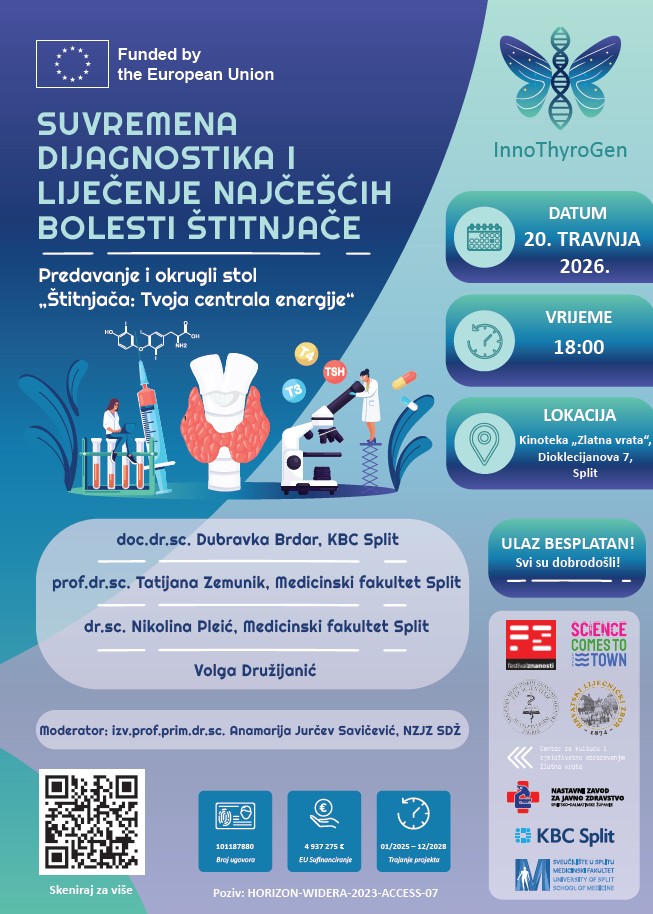 U suorganizaciji Nastavnog zavoda za javno zdravstvo Splitsko-dalmatinske županije održati će se predavanje i okrugli stol „Štitnjača: Tvoja centrala energije“ u ponedjeljak, 20. travnja 2026.g. u 18 sati u kinoteci Zlatna vrata, Dioklecijanova 7, Split.