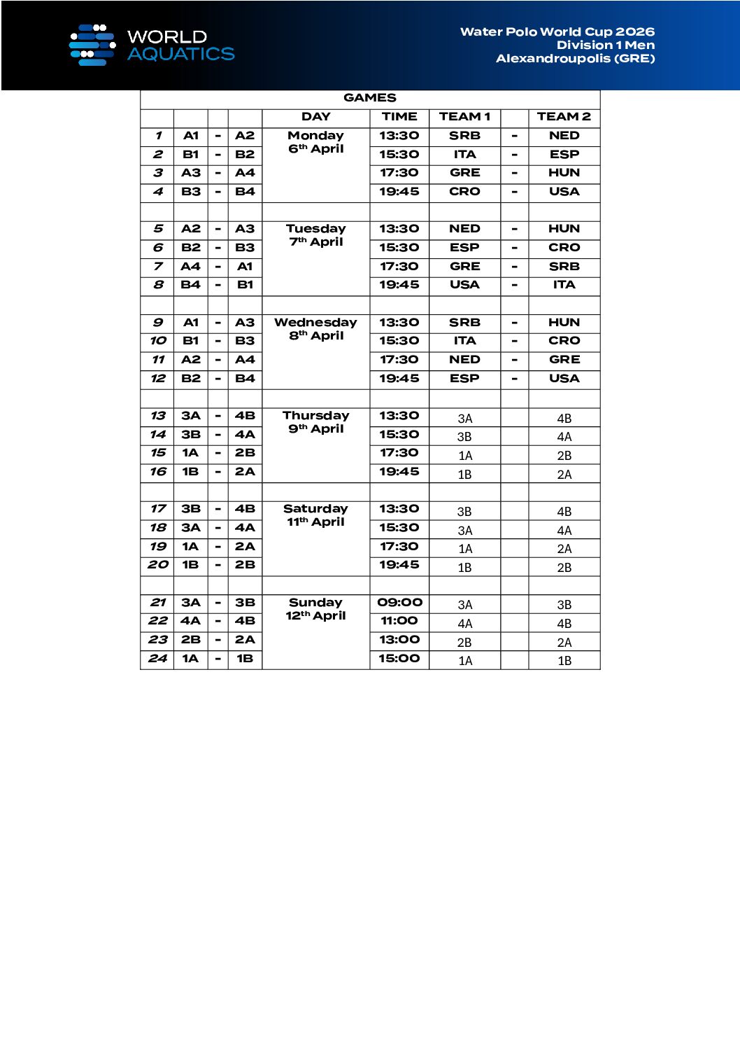 Prvo je to okupljanje Barakuda nakon Europskog prvenstva odigranog u siječnju, dok će poslužiti kao priprema reprezentacije za odlazak na turnir Svjetske lige (Division 1).Turnir se održava u grčkom Alexandroupolisu, a naši reprezentativci prvu utakmicu igraju već u ponedjeljak protiv reprezentacije SAD-a.U nastavku donosimo početni raspored utakmica naše skupine, dok u privitku možete pronaći kompletan službeni raspored natjecanja.