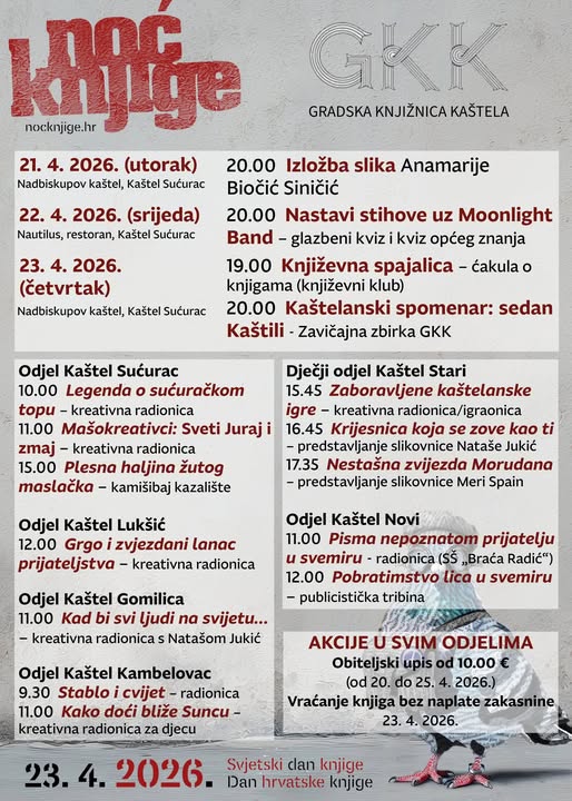 Povodom Svjetskog dana knjige i Dana hrvatske knjige, u Gradskoj knjižnici Kaštela, pripremili su, bogat i raznovrstan program koji će se održavati od utorka (21. 4.) do četvrtka (23. 4.) diljem Kaštela.