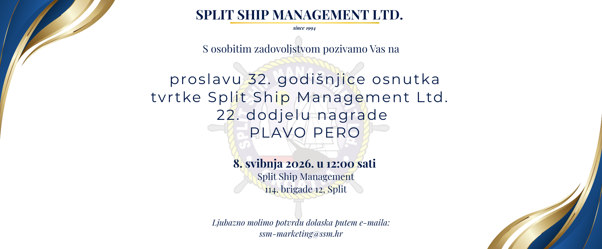 Svečana dodjela nagrade Plavo pero za 2025. godinu, će se održati 8. svibnja 2026. godine u 12:00 sati u prostorijama Split Ship Managementa, na adresi Ulica 114. brigade 12 u Splitu.