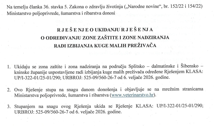 Ministarstvo poljoprivrede, šumarstva i ribarstva donijelo je Rješenje kojim se ukida zona ograničenja (zona zaštite i zona nadziranja) uspostavljena zbog pojave kuge malih preživača na području Šibensko – kninske i Splitsko – dalmatinske županije.